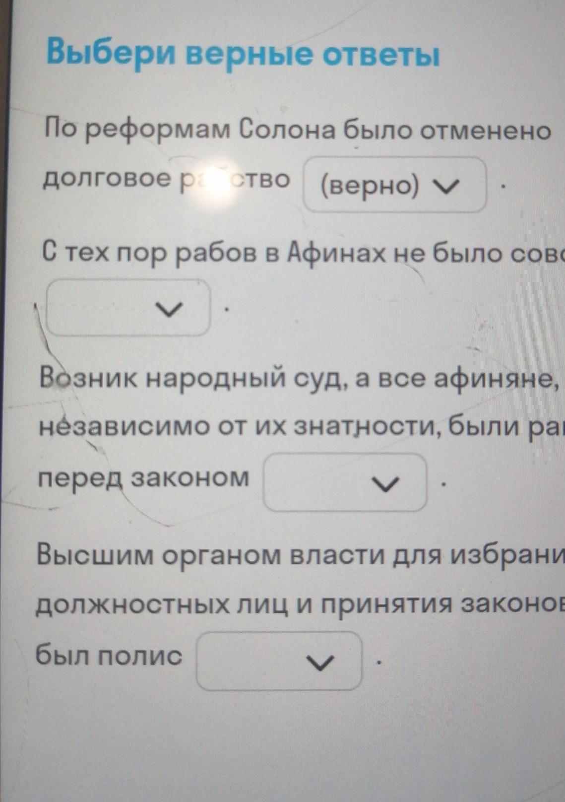 1 - верно. 2 - не совсем верно, т.к. были рабы, которые привозились из других стран. Однако если считать именно афинских рабов - то, действительно, не было. Но я бы лучше выбрала "нет". 3 - нет, все равно не было такой уж равности. 4 - нет, народное собрание