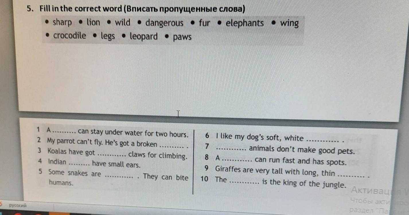 5. Fill in the correct word (Boncatb nponyWeHbble crosa) • sharp • lion • wild • dangerous • fur • elephants • wing • crocodile • legs • leopard • paws