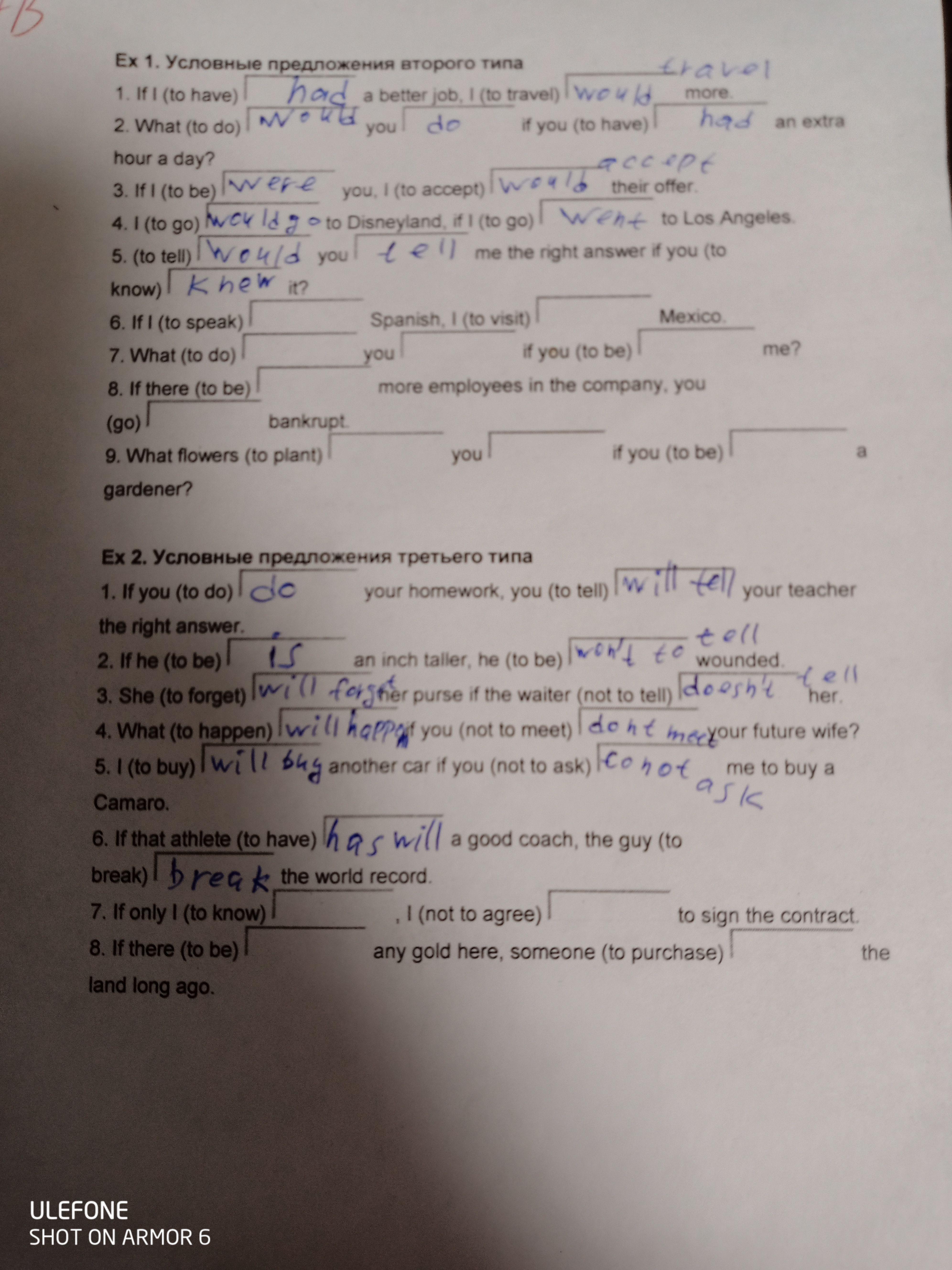 ex. 1. 1. had done, would have told. 2. had been, would have been. 3.wouldhave forgotten, hadn't told her. 4.what would have happened, hadn't met. 5. Would have bought, had not asked. 6.had had, would have broken.