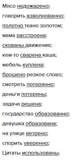 3. Спишите, вставив пропущенные буквы. Подчеркните наречия. Мясо недозжаре.о; говорить взволнованно; полотно ткало Н. золотом; мама расстроена; скованы движения; кем-то сваре..а каша; мебель куплена; броше..о резкое слово; смотреть потеря..0; деньги потеря..ы; задача реше..а; государство образо- вано; девушка образова...а; на улице ветре..о; спорить увере..0; Цитаты использова..Ы.