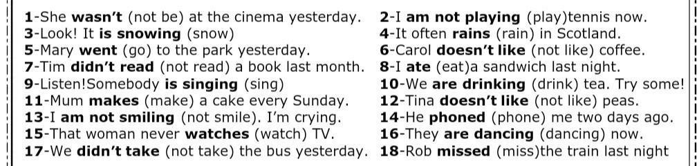 EXERCISE 1 Fill the gaps using: present simple/present continuous/past simple. Match the pictures. 1-She (not be) at the cinema yesterday. 2-1 (play)tennis now. 3-Look! It (snow) 4-It often (rain) in Scotland. 5-Mary (go) to the park yesterday. 6-Carol (not like) coffee. 7-Tim (not read) a book last month. 8-1 (eat)a sandwich last night. 9-Listen! Somebody (sing) 10-We (drink) tea. Try some! 11-Mum (make) a cake every Sunday. 12-Tina (not like) peas. 13-1 (not smile). I'm crying. 14-He (phone) me two days ago 15-That woman never (watch) TV. 16-They (dancing) now. (miss)the train last night. 17-We (not take) the bus yesterday. 18-Rob