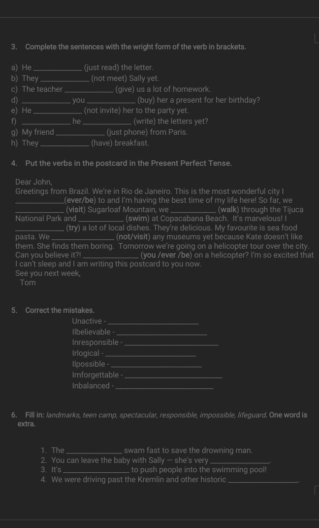 4. have ever been, visited, walked, swam, tried, didn't visit, have you ever been