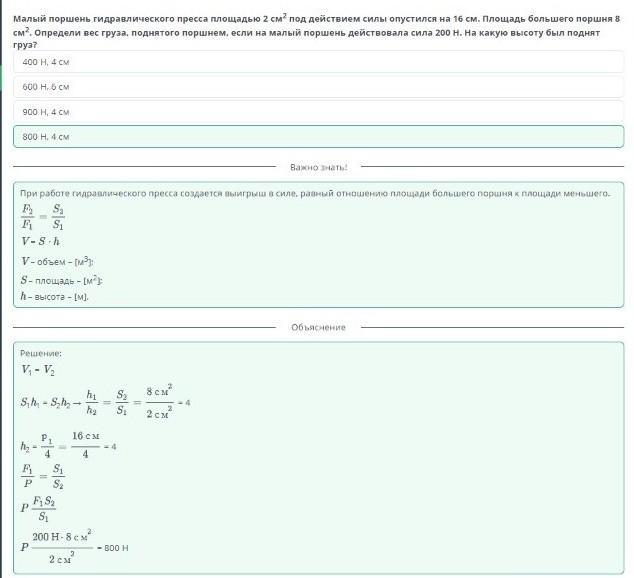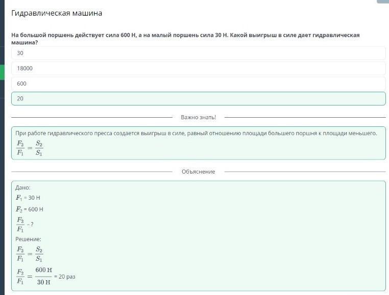 На большой поршень действует сила 600 Н, а на малый поршень сила 30 Н. Какой выигрыш в силе дает гидравлическая машина?