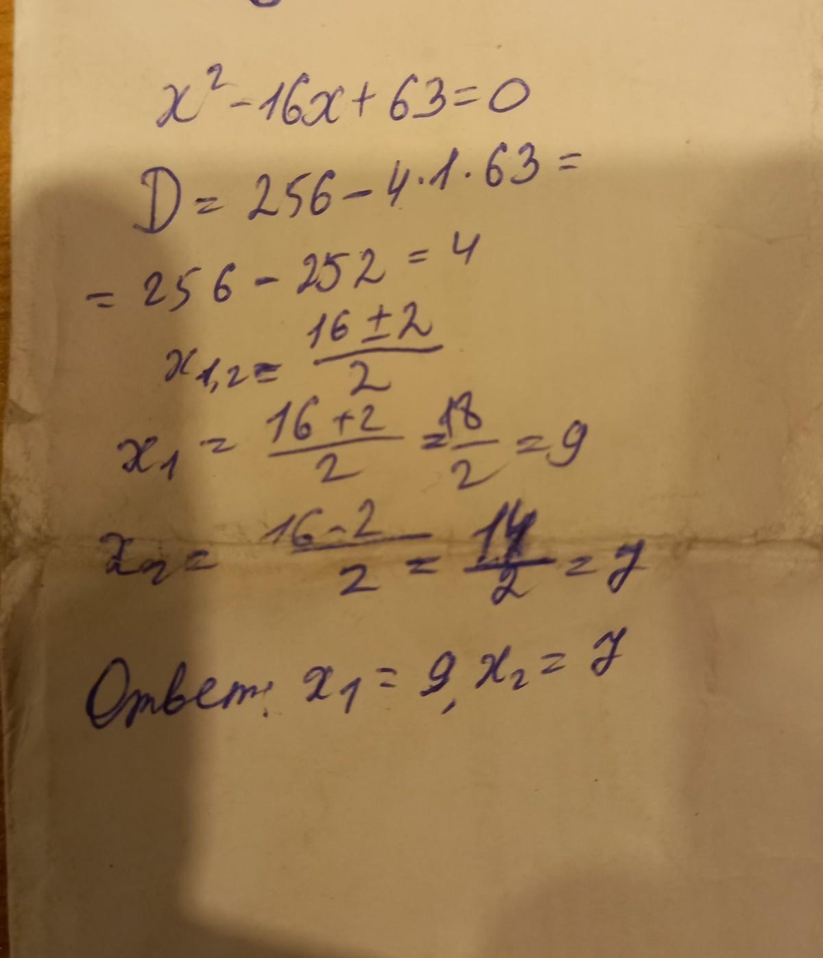 D=(-16)в квадрате - 4*1*63=256-252=4=2