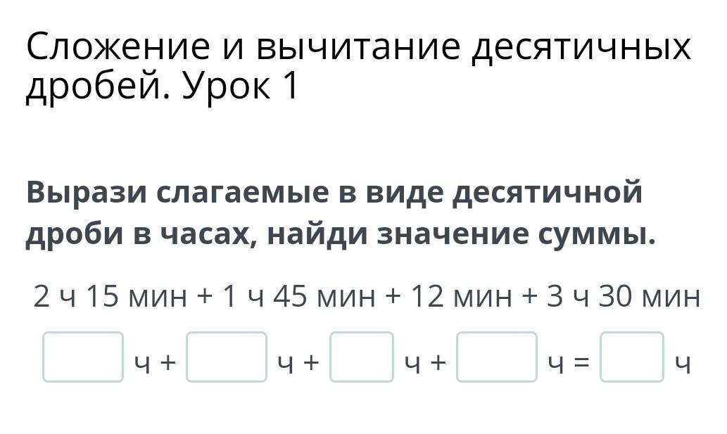 Вырази слагаемые в виде десятичной дроби в часах, найди значение суммы 2ч 15 мин + 1ч 45 мин + 12 мин + 3ч 30 мин
