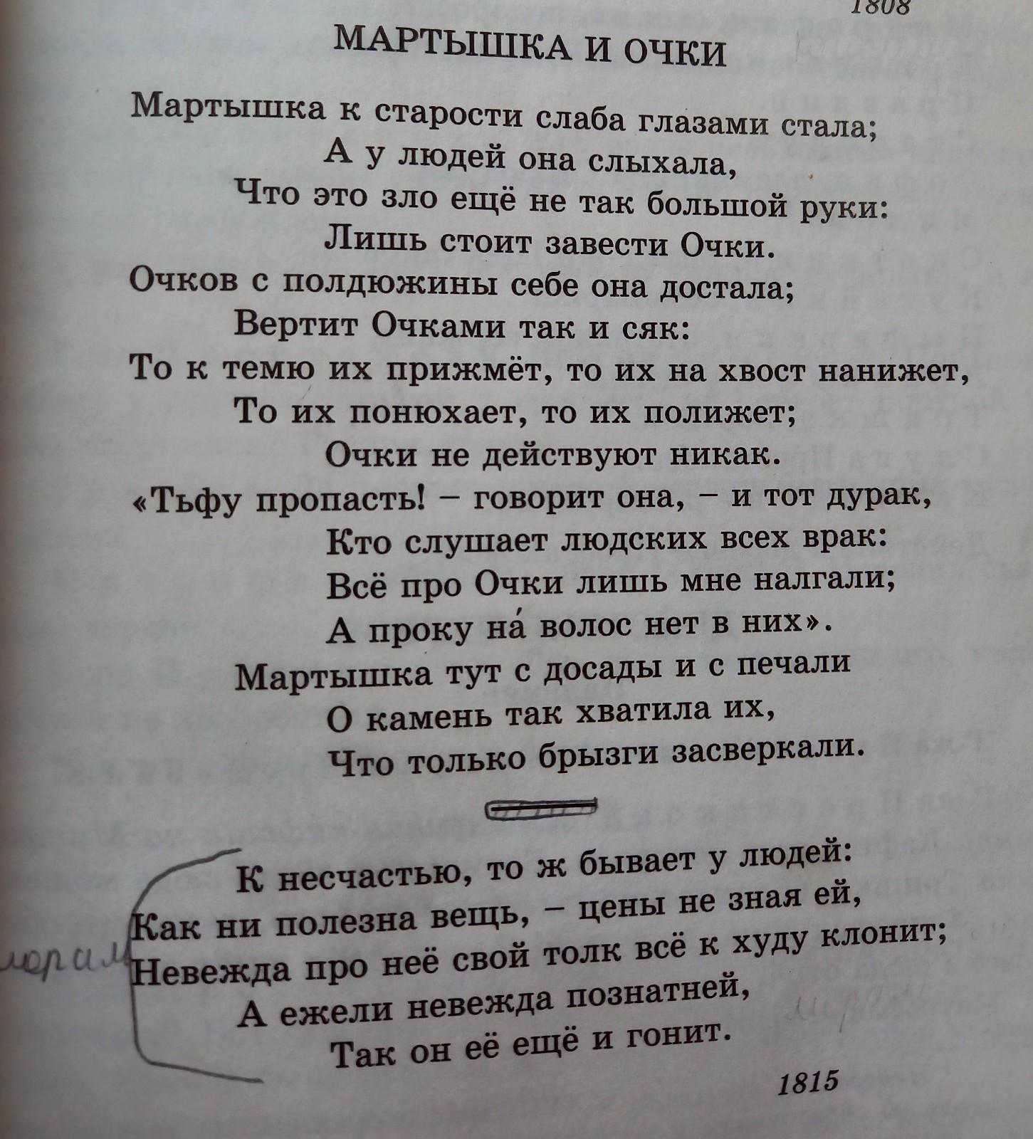 2 часть – "К несчастью, то ж бывает у людей" – "Так он ее ещё и гонит". (мораль)