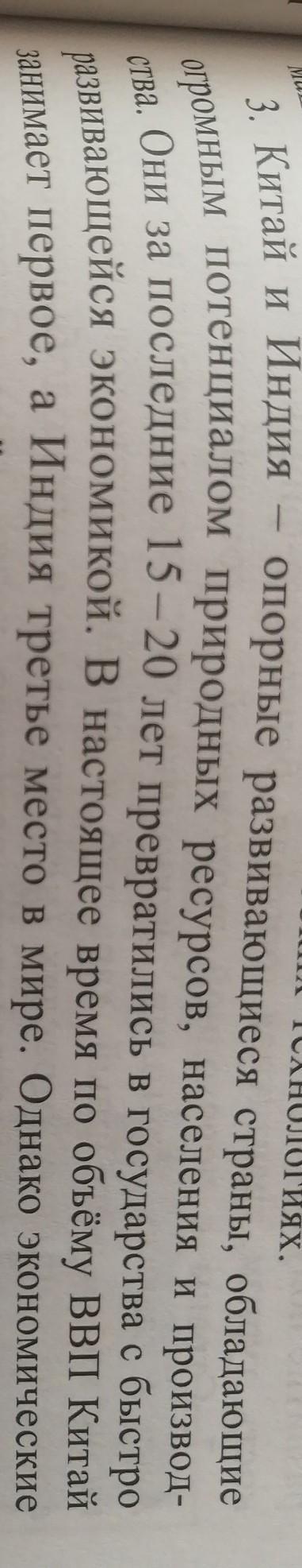 Ответ:Китай и Индия - опорно-развивающиеся страны, обладающие огромным потенциалом природных ресурсов, населения и производства. Хотя они за последние 15-20 лет превратились в государства с быстро-развивающей экономикой, перед обеими странами стоят сложные проблемы социального развития.