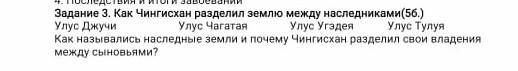 Джучи — земли от Иртыша до Уральских гор и далее на юг до Каспийского и Аральского морей, из среднеазиатских владений — Хорезм и область Сырдарьи; Чагатаю — Мавераннахр, Семиречье, Кашгарию; Угедею — Западную Монголию, Тарбагатайский регион