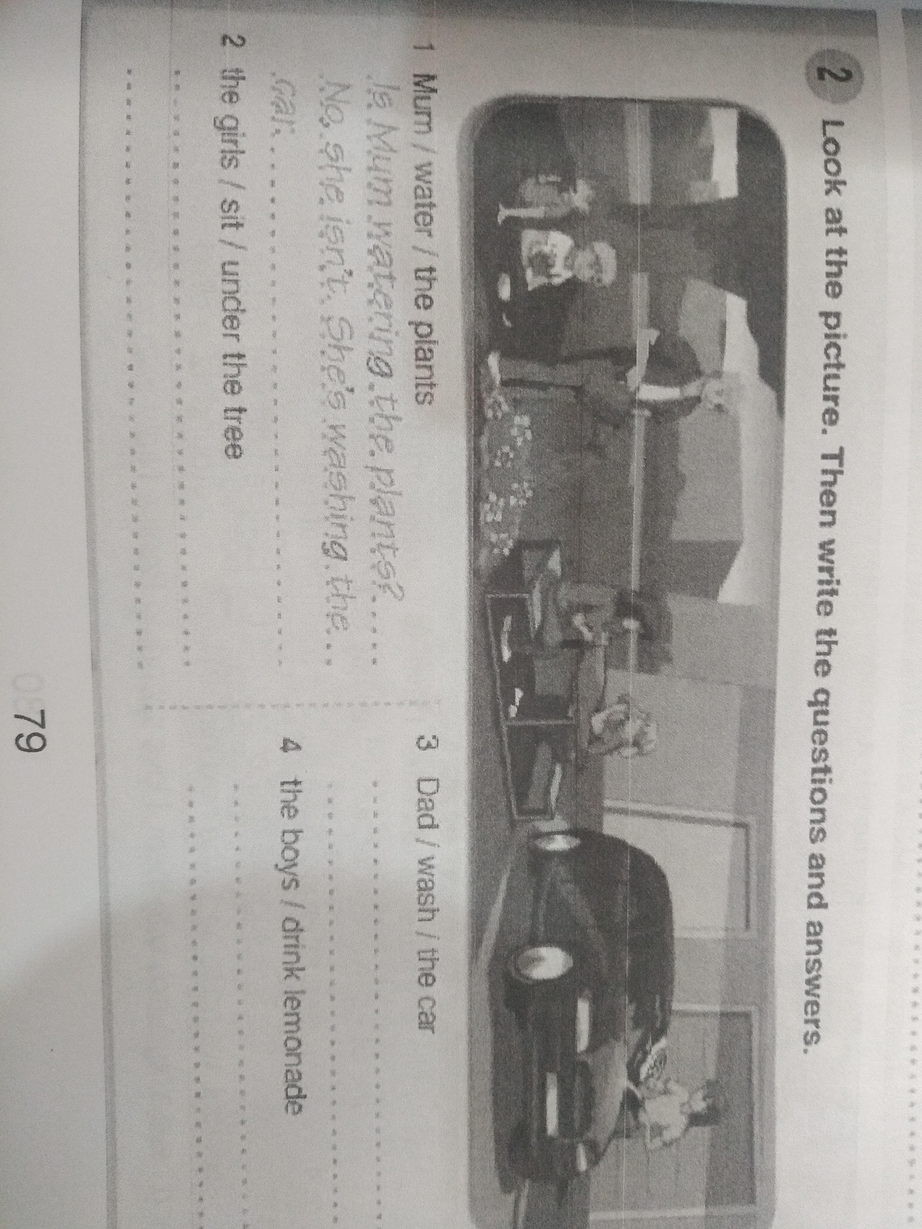 Does dad wash the car? —No, he isn't. He waters the flowers
