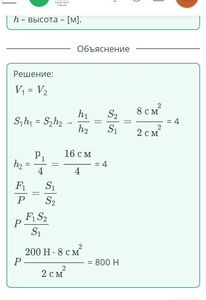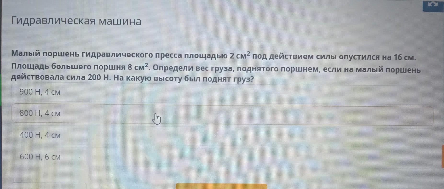 Малый поршень гидравлического пресса площадью 2 см² под действием силы опустился на 16 см. Площадь большего поршня 8 см². Определи вес груза, поднятого поршнем, если на малый поршень действовала сила 200 Н. На какую высоту был поднят груз?
