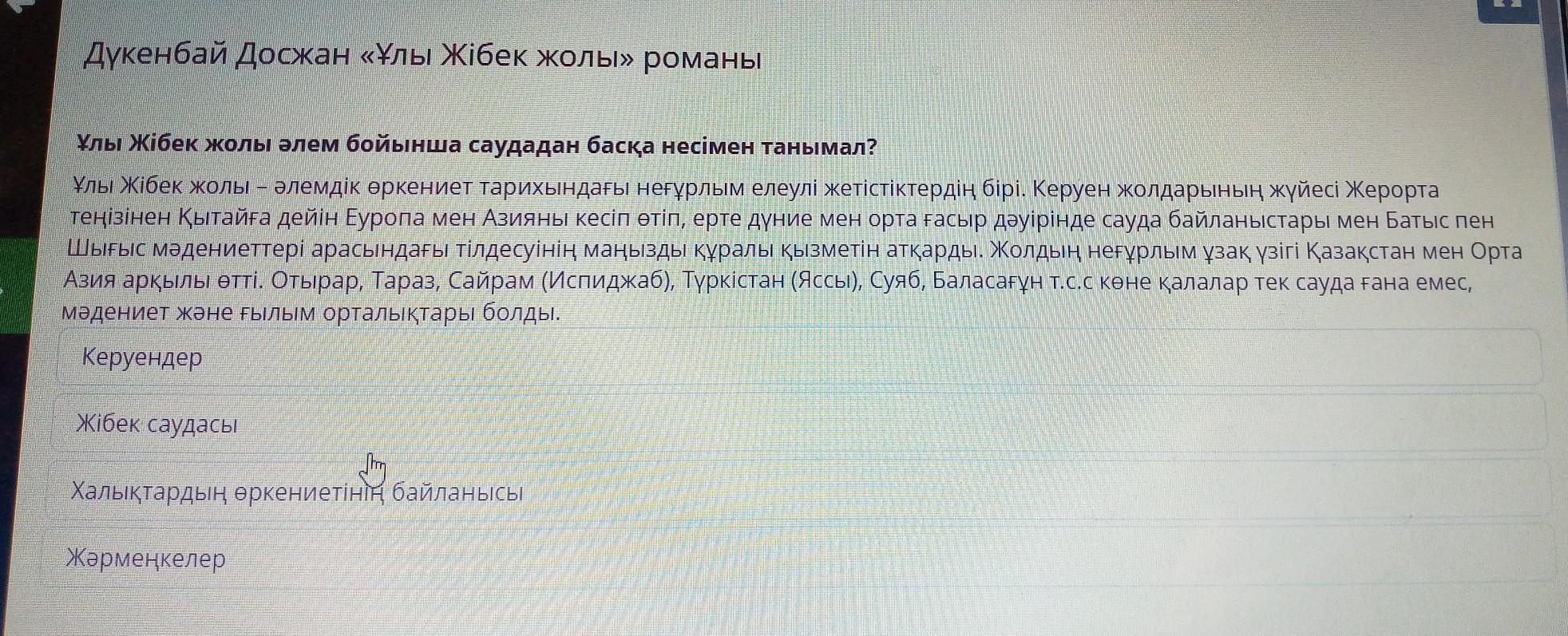 Дүкенбай Досжан «Ұлы Жібек жолы» романы Ұлы Жібек жолы әлем бойынша саудадан басқа несімен танымал? Ұлы Жібек жолы – әлемдік өркениет тарихындағы неғұрлым елеулі жетістіктердің бірі. Керуен жолдарының жүйесі Жерорта теңізінен Қытайға дейін Еуропа мен Азияны кесіп өтіп, ерте дүние мен орта ғасыр дәуірінде сауда байланыстары мен Батыс пен Шығыс мәдениеттері арасындағы тілдесуінің маңызды құралы қызметін атқарды. Жолдың неғұрлым ұзақ үзігі Қазақстан мен Орта Азия арқылы өтті. Отырар, Тараз, Сайрам (Испиджаб), Түркістан (Яссы), Суяб, Баласағұн Т.С.С көне қалалар тек сауда ғана емес, мәдениет және ғылым орталықтары болды. Керуендер Жібек саудасы Халықтардың өркениетінің байланысы Жәрмеңкелер