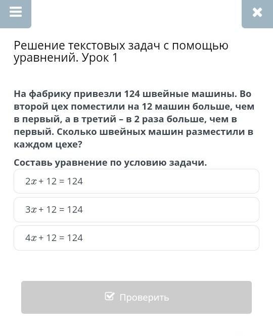 на фабрику привезли 124 швейные машины . во второй цех поместили на 12 машин больше ,чем в первый .а в третий в 2 раза больше ,чем в первый. сколько швейных машин разместили в каждом цехе? составьте уравнение по условию задачи.