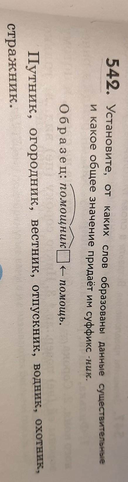 542. Установите, от каких слов образованы данные существительные и какое общее значение придаёт им суффикс -ник. Образец: помощник е помощь. Путник, огородник, вестник, отпускник, водник, охотник, стражник.