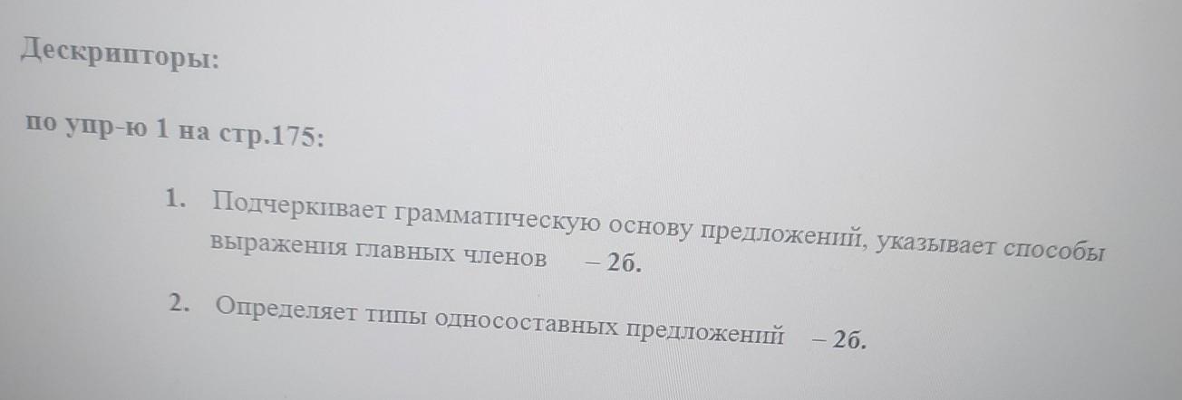 4. Выполнить морфемный разбор слов: сырость, затрачивают, вырастить, сеял 16. Дескрипторы: по упр-ю 1 на стр.175: 1. Подчеркивает грамматическую основу предложений, указывает способы выражения главных членов - 26. 2. Определяет типы односоставных предложений - 26. Итого: 10 баллов - я