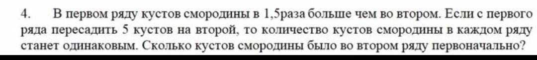 4. В первом ряду кустов смородины в 1,5раза больше чем во втором. Если с первого ряда пересадить 5 кустов на второй, то количество кустов смородины в каждом ряду станет одинаковым. Сколько кустов смородины было во втором ряду первоначально?