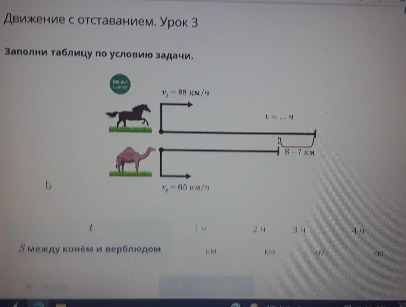Движение с отставанием. Урок 3 Заполни таблицу по условию задачи. ", — 88 км/ч S - ? ICM 7 ) 2, 65 км/ч t 1 ч 24 ЗЧ 4 ч Ѕ между конём и верблюдом KM KM KM КМ