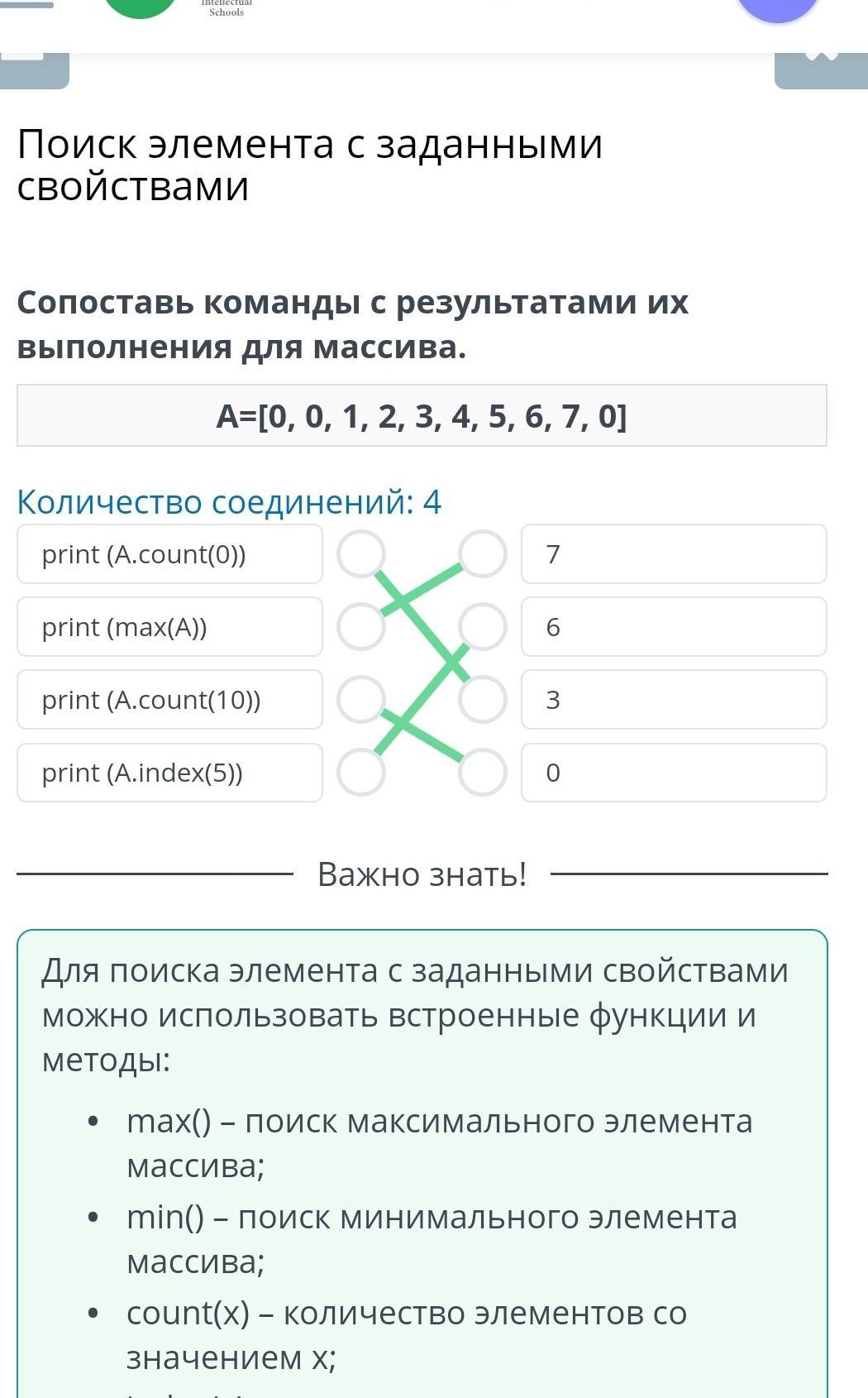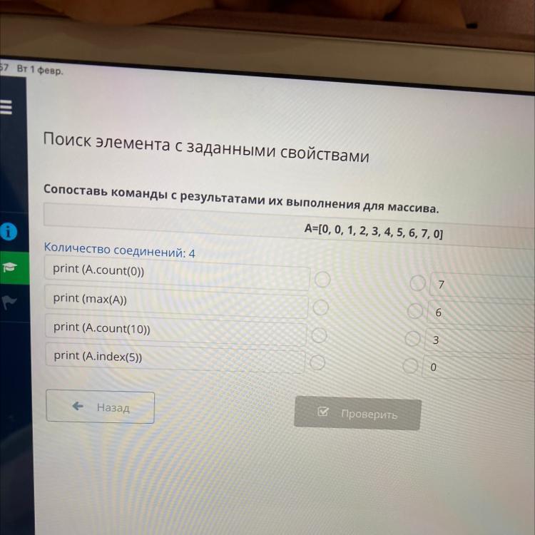 Сопоставь команды с результатами их выполнения для массива.