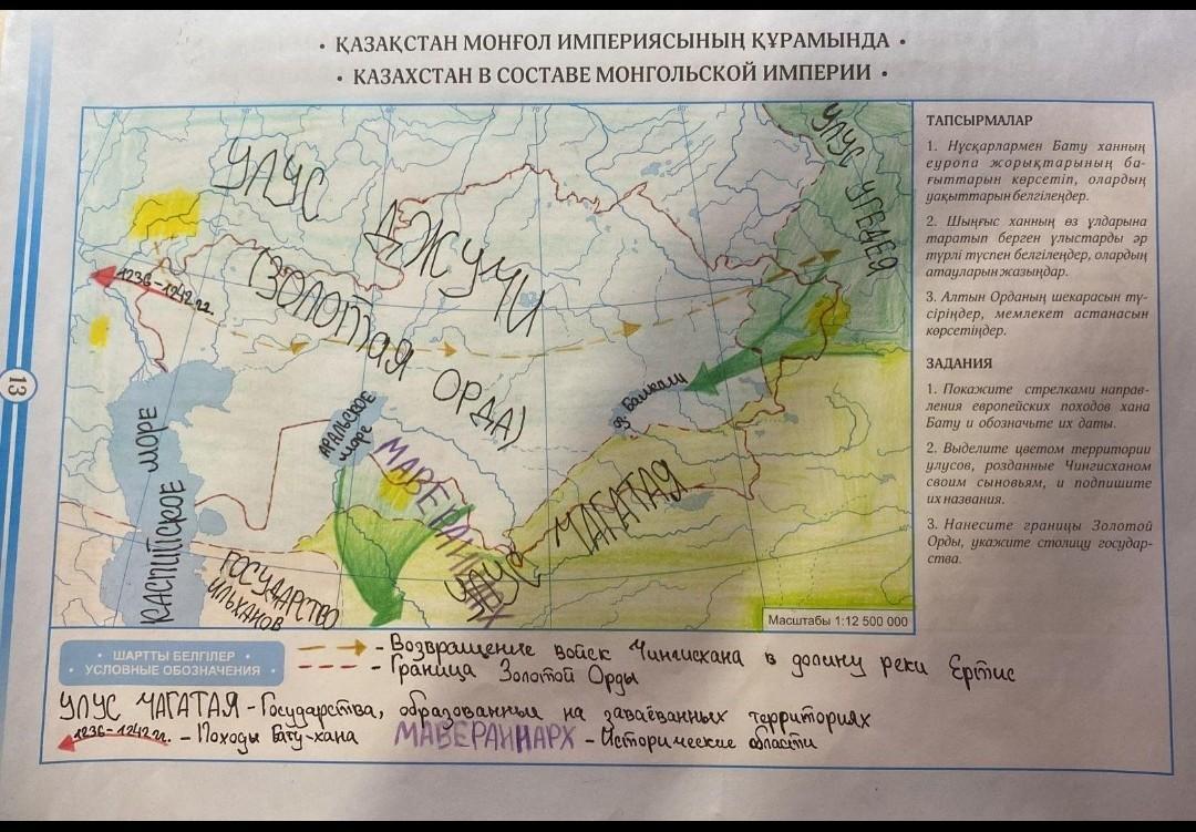 ЗАДАНИЯ 1. Покажите стрелками направ- ления европейских походов хана Бату и обозначьте их даты. 2. Выделите цветом территории улусов, розданные Чингисханом своим сыновьям, и подпишите их названия.