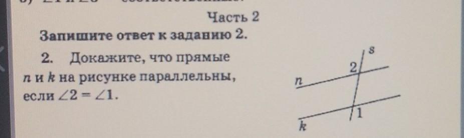 угол 2 и 1( соответсвующие, а значит равны) а значит прямая s секущая двух параллельных прямых -n, k значит они параллельнпараллельныl
