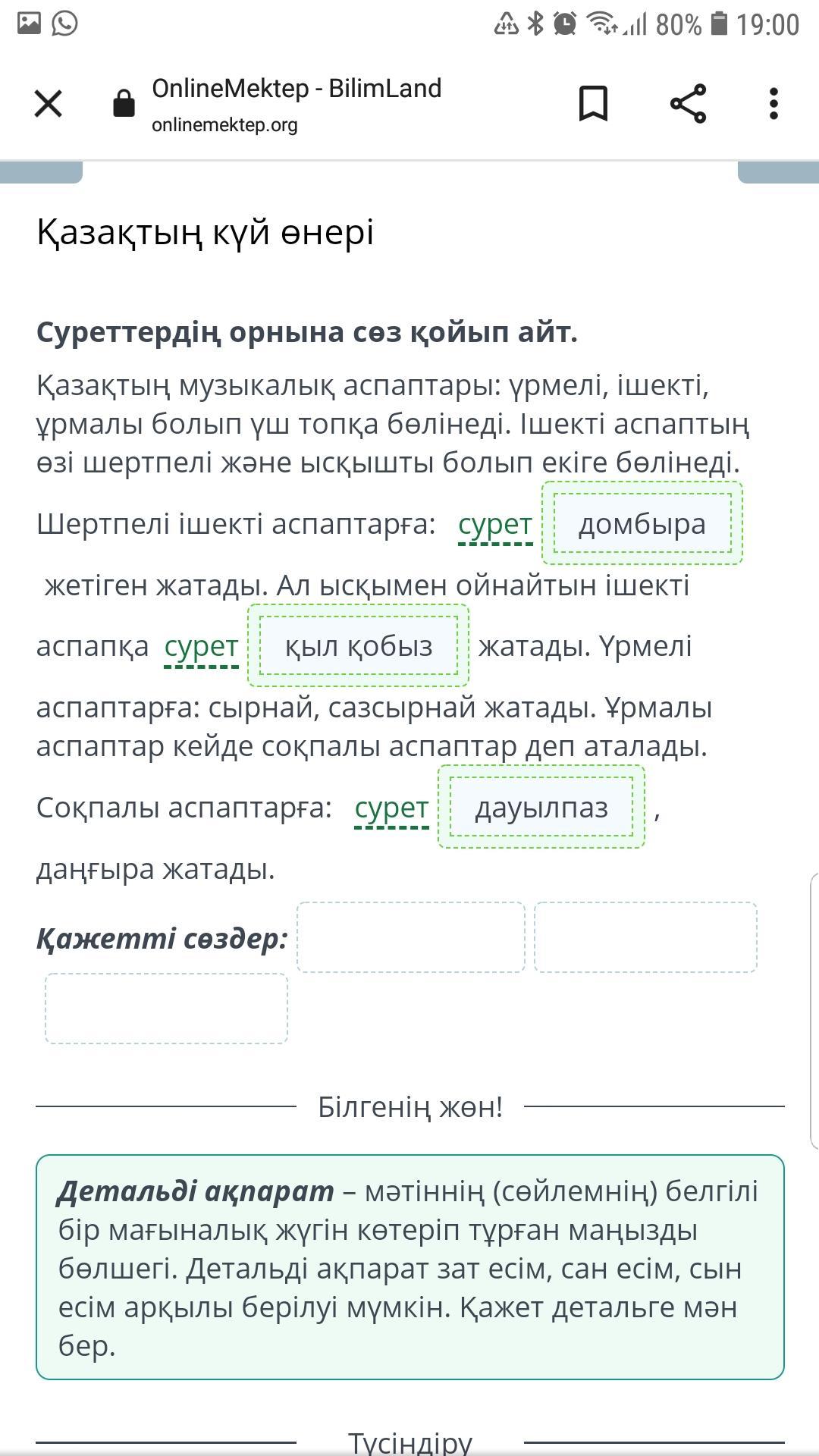 қазақтың күй өнері Суреттердің орнына сөз қойып айт. Қазақтың музыкалық аспаптары: үрмелі, ішекті, ұрмалы болып үш топқа бөлінеді. Ішекті аспаптың өзі шертпелі және ысқышты болып екіге бөлінеді. Шертпелі ішекті аспаптарға: сурет жетіген жатады. Ал ысқымен с А ойнайтын ішекті аспапқа сурет жатады. Үрмелі аспаптарға: сырнай, сазсырнай жатады. Ұрмалы аспаптар кейде соқпалы аспаптар деп аталады. Соқпалы аспаптарға: сурет ) даңғыра жатады. Қажетті сөздер: дауылпаз НЕ домбыра «» қыл қобыз