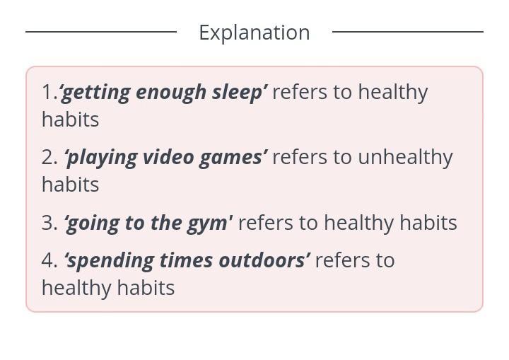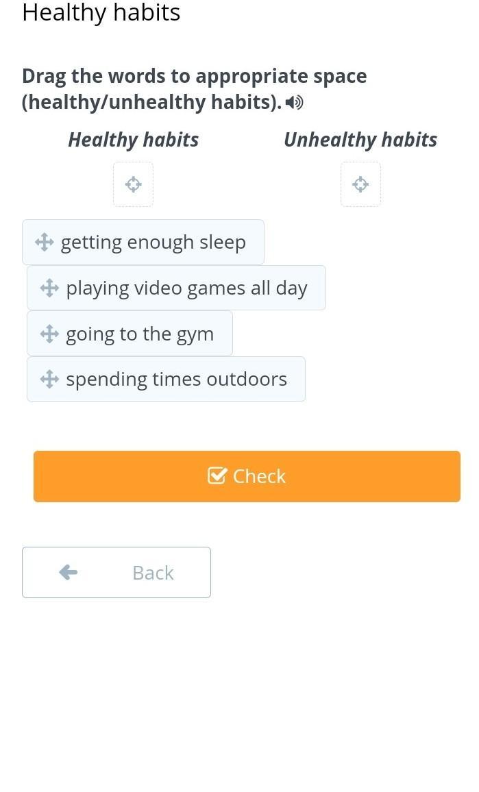 Healthy habits Drag the words to appropriate space (healthy/unhealthy habits). Healthy habits going to the gym Unhealthy habits getting enough sleep playing video games all day spending times outdoors Back Check