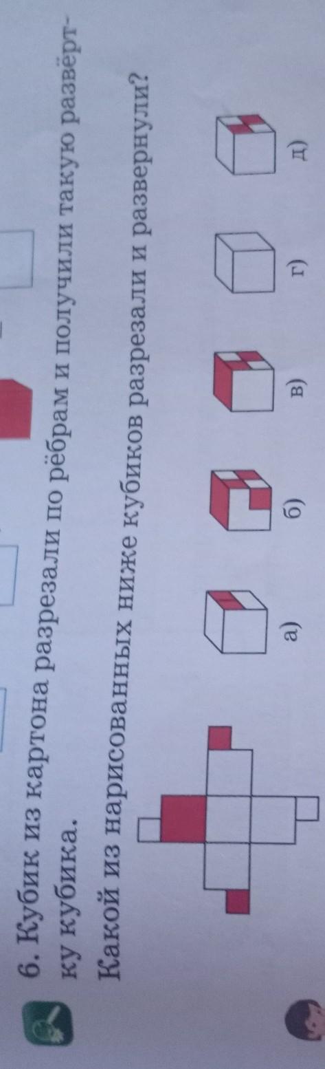 6. Кубик из картона разрезали по рёбрам и получили такую развёрт- ку кубика. Какой из нарисованных ниже кубиков разрезали и развернули? б) Б) г )