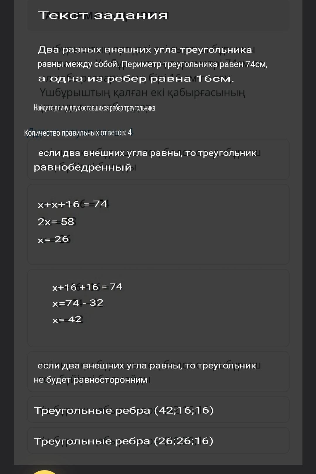 Внимание!!! x+x+16=74; 2x=58; x=/=26; x=29