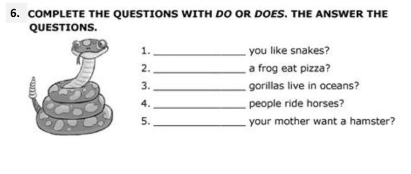 COMPLETE THE QUESTIONS WITH DO OR DOES. THE ANSWER THE QUESTIONS. 1) you like snakes? 2) a frog eat pizza? 3) gorillas live in oceans? 4) people ride horses? 5) your mother want a hamster?