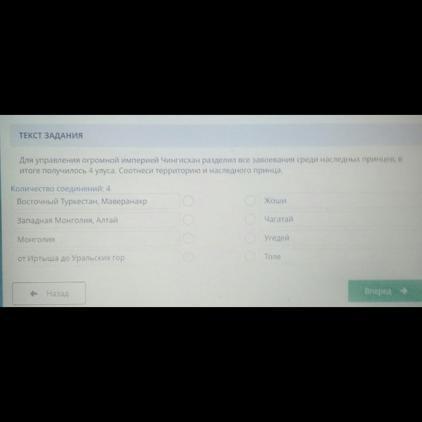 итоге получилось 4 улуса. Соотнеси территорию и наследного принца.