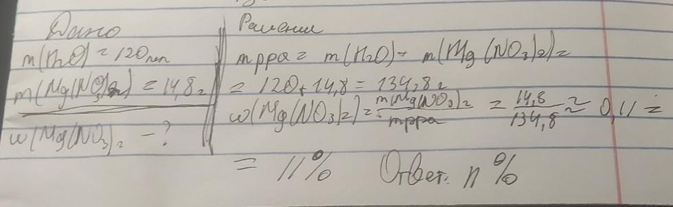 рассчитайте массовую долю растворенного вещества в растворе образованном из 120 мл воды и 14.8г нитрата магния