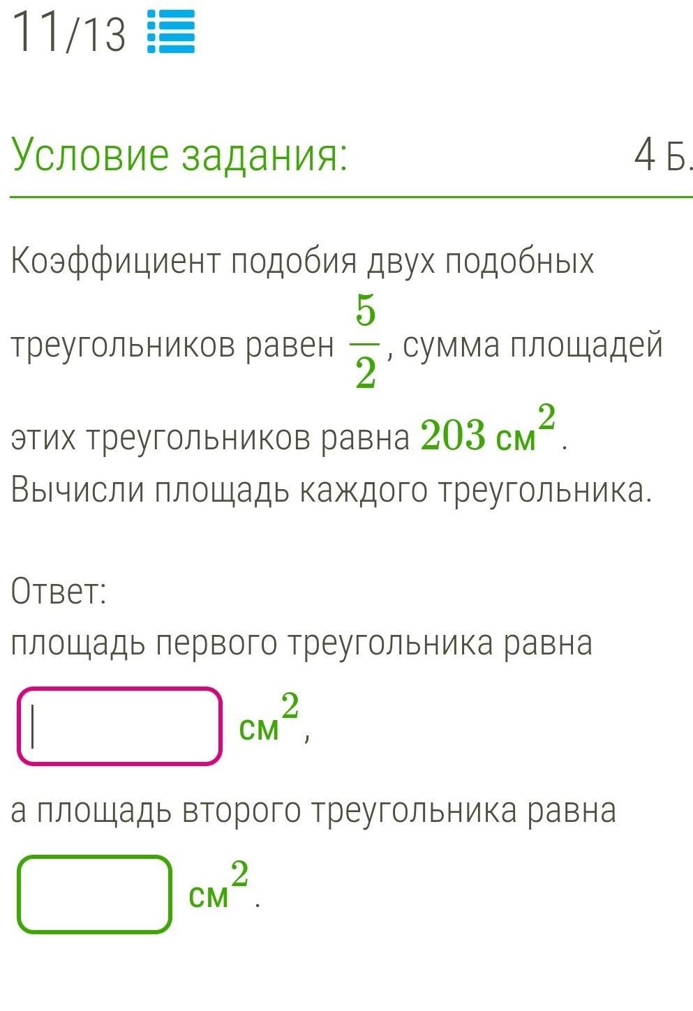 Коэффициент подобия двух подобных 5 треугольников равен 2 сумма площадей этих треугольников равна 203 см2 Вычисли площадь каждого треугольника. Ответ: Площадь первого треугольника равна 2 CM