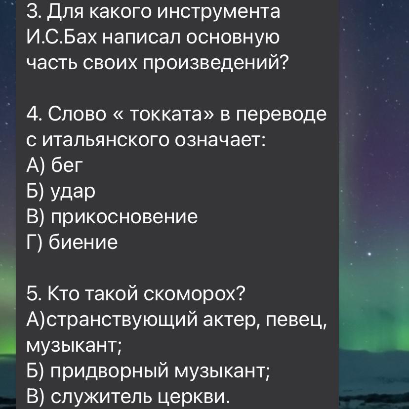 3.Иоганн Себастьян Бах писал свои произведения для органа, клавира,скрипки, виолончели, флейты и оркестра