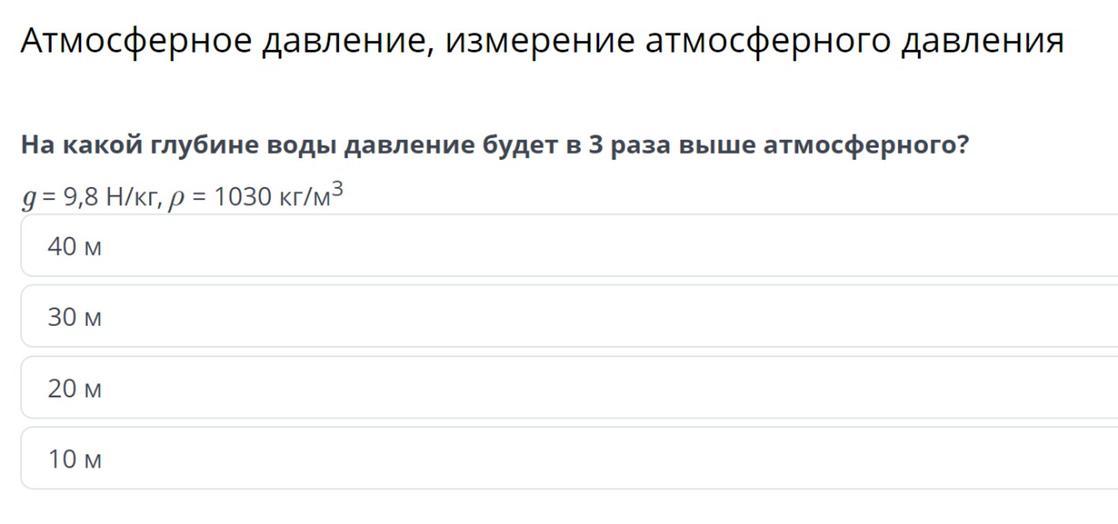 На какой глубине воды давление будет в 3 раза выше атмосферного?