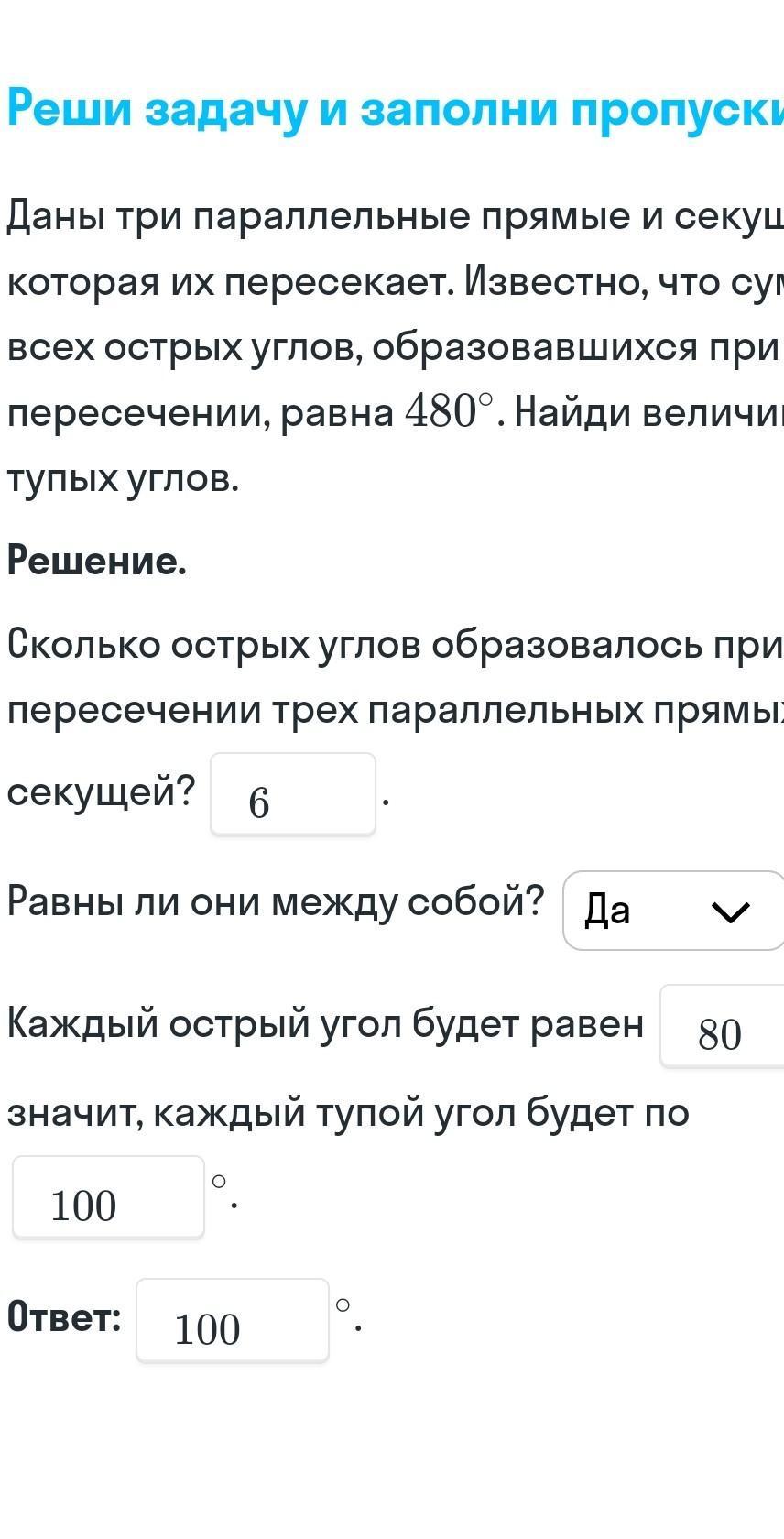 Даны 3 параллельные прямые и секущая которая их пересекает. Известно что сумма всех острых углов образовавшихся при пересечении равна 480°. найди величину тупых углов СРОЧНО