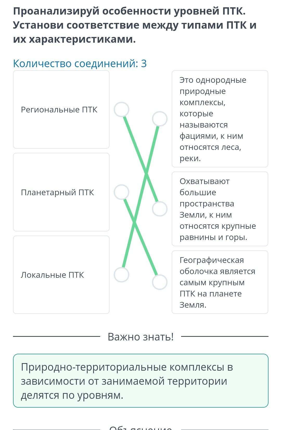 Формирование природных В Формирование природних policy/schedule/01 02 2022/lesson/f9d399) 6-1 (01.0.10. 30. 1. 11. 3.1.19 ИВНЫЙ УРОК Формирование природно-территориальных комплексов ие природно- БНЫХ Урок 1 Проанализируй особенности уровней пти. Установи соответствие между типами птKи их характеристиками. рока Количество соединений: 3 Региональные ПТК Это однородные природные комплексы, которые называются фациями, к ним относятся леса, реки. Tupport Планетарный ПТК Охватывают большие пространства Земли, К ним относятся крупные равнины и горы. Локальные ПТК Географическая оболочка является самым крупным ПТК на планете Земля. Назад