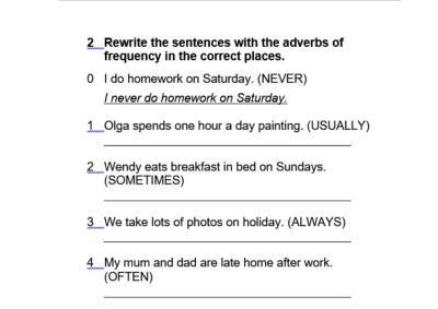 Ответ:Olga usually spends one hour a day painting 2. Wendy sometimes eats breakfast in bad on sundays 3.We always take lots of photos on holiday