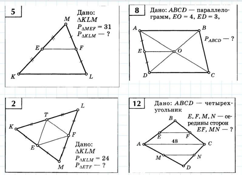 2. Треугольник ETF состоит из средних линий треугольника KLM; ⇒ Р(ETF)=P(KLM)/2=24/2=12 ед.