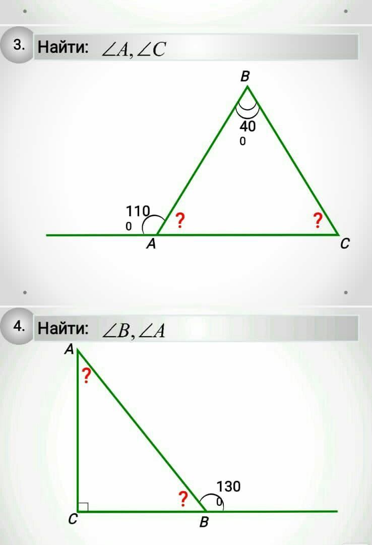 в первой задаче внутренний угол А равен:180° минус внешний угол 110°=70°(т.к.они вертикальные)