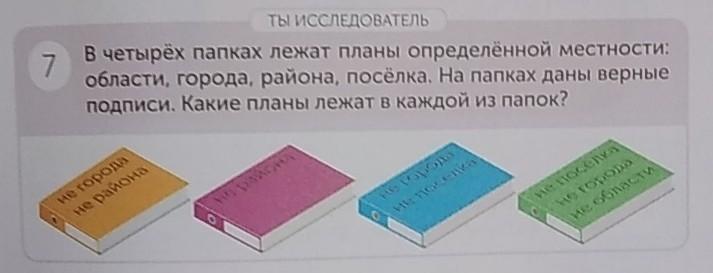 ТЫ ИССЛЕДОВАТЕЛЬ 7 В четырёх папках лежат планы определённой местности: области, города, района, посёлка. На папках даны верные подписи. Какие планы лежат в каждой из папок?