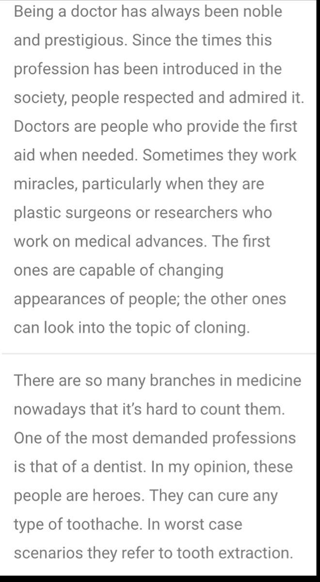 Быть врачом благородно и престижно. С тех пор, как эта профессия появилась в обществе, люди уважают ее и восхищаются. Врачи — это люди, которые оказывают первую помощь при необходимости. Иногда они творят чудеса, особенно если это пластические хирурги или исследователи, которые работают в области медицинских достижений. Первые способны изменить внешность людей; а вторые могут работать над исследованиями в области клонирования.