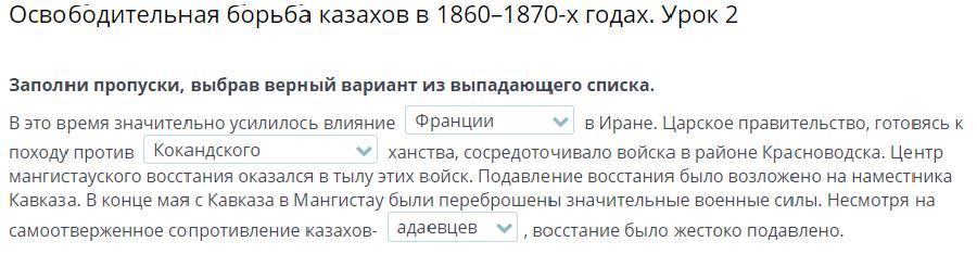 В это время значительно усилилось влияние Англии походу против Хивинского в Иране. Царское правительство, готовясь к ханства, сосредоточивало войска в районе Красноводска. Центр мангистауского восстания оказался в тылу этих войск. Подавление восстания было возложена наместника Каваза. В конце мая с Кавказа в Мангистау были переброшены значительные военные силы. Несмотря на самоотверженное сопротивление казахов- адаевцев , восстание было жестоко подавлено.
