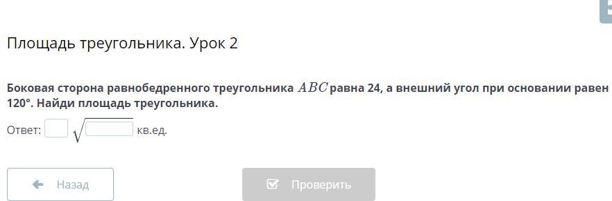 Боковая сторона равнобедренного треугольника ABC равна 24, а внешний угол при основании равен 120°. Найди площадь треугольника.