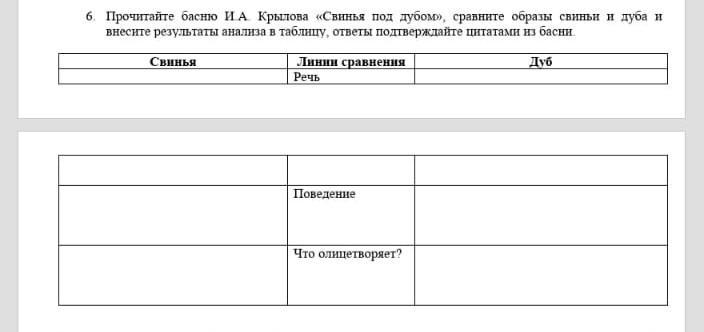 Прочитайте басню И.А. Крылова «Свинья под дубом», сравните образы свиньи и дуба и внесите результаты анализа в таблицу, ответы подтверждайте цитатами из басни. Свинья Линии сравнения Дуб Речь Поведение Что олицетворяет? ПОМОГИТЕ ПОЖАЛУЙСТА СРОЧНО!!!