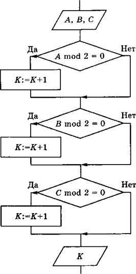 Дальше В - четное, соответственно идем по "да" K=K+1 = 1
