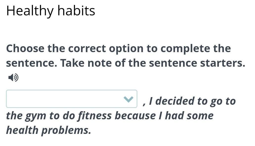 Healthy habits Choose the correct option to complete the sentence. Take note of the sentence starters. , I decided to go to the gym to do fitness because I had some health problems. Back Check