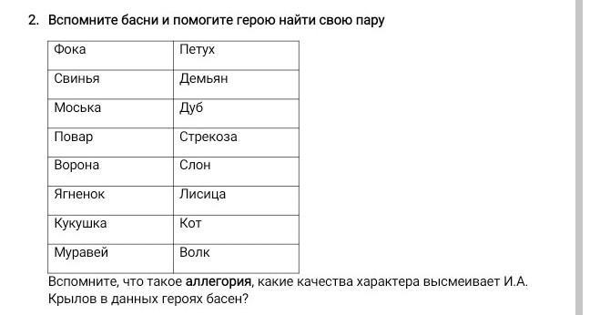 ПОМОГИТЕ ПОЖАЛУЙСТА ЭТО СОР Вспомните басни и помогите герою найти свою пару Фока Петух Свинья Демьян Моська Дуб Повар Стрекоза Ворона Слон Ягненок Лисица Кукушка Кот Муравей Волк Вспомните, что такое аллегория, какие качества характера высмеивает И.А. Крылов в данных героях басен?