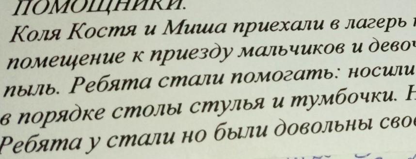 Расставить знаки препинания. Подчеркните однородные члены как члены предложения. Составьте схемы ПОМОЩНИКИ. Коля Костя и Миша приехали в лагерь на день раньше всего отряда. Им дали задание промовить помещение к приезду мальчиков и девочек. Когда они приехали в лагерь, в доме уже мыли полы вытирали пыль. Ребята стали помогать: носили воду перетаскали с чердака все койки тюфяки и материалды. Расст в порядке столы стулья и тумбочки. Нарвали цветов и поставили их на столах и на окнах в банках с во ны своей работой. Пж даю 10 баллов