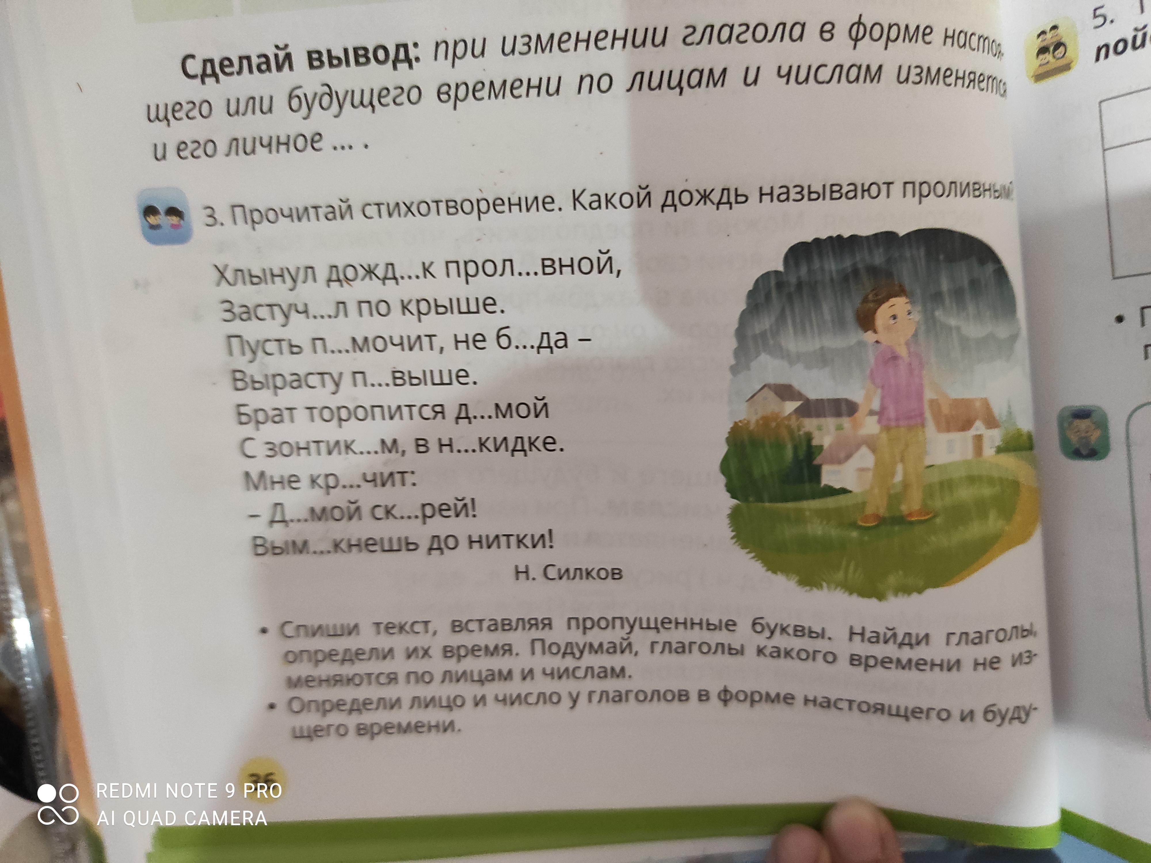 Хлынул дождик проливной, застучал по крыше. Пусть помочит, не беда–Вырасту повыше. Брат торопиться домой с зонтиком, в накидке. Мне кричит: – Домой скорей! Вымокнешь до нитки.