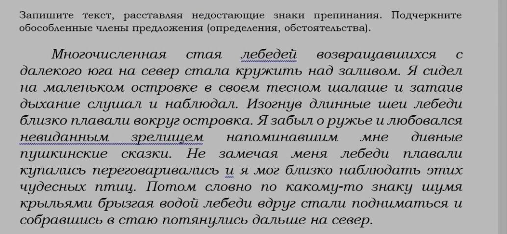 Потом, /словно по какому-то знаку/_._._ , /шумя крыльями/_._._ , /брызгая водой/_._._ , лебеди вдруг стали подниматься и, /собравшись в стаю/_._._ , потянулись дальше на север.