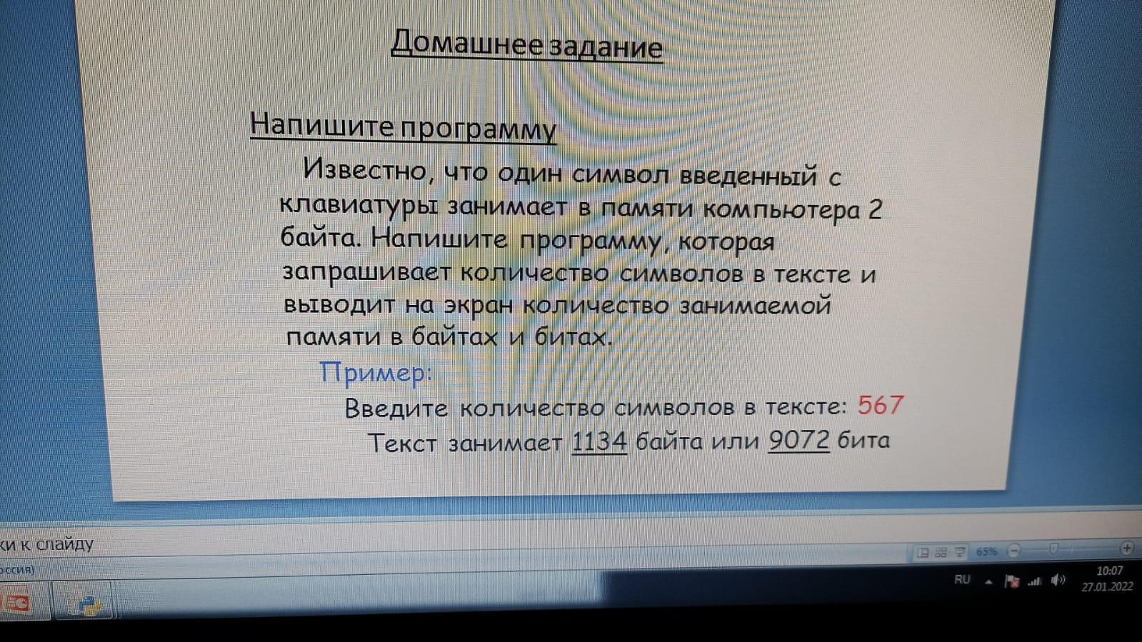 print('Занимает '+str(n * 2) + ' байта или ' + str(n*2*8) + ' бита')